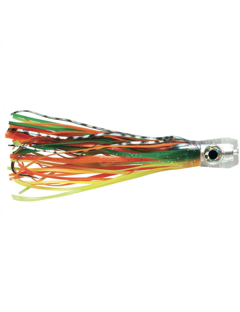 Tête en résine transparente à reflets holographiques avec yeux 3D et film métallique irisé en position verticale centrale pour capter et réfléchir la lumière. Jupe plastique résistante malgré une extrême mobilité avec reflets métalliques irisés. Face avant de la tête fortement concave pour une importante poussée sur l'eau.